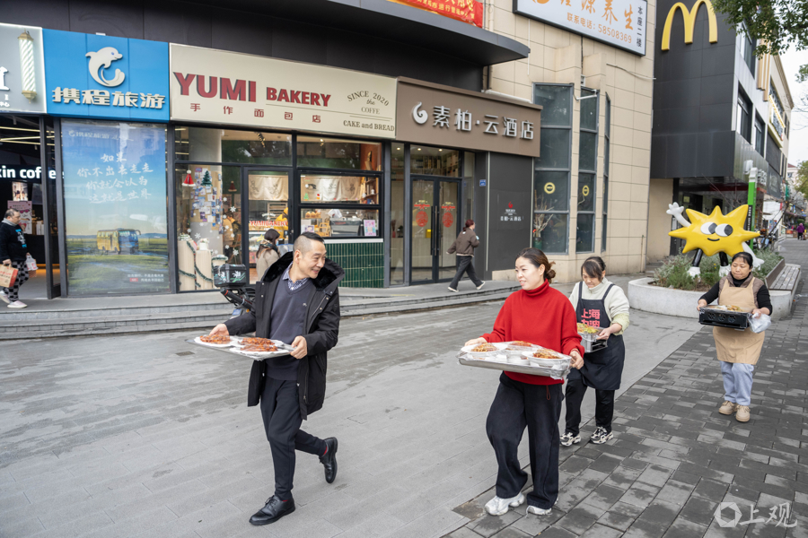 陈少均夫妇和店员们将刚出锅的热乎菜送往家宴现场。