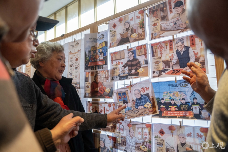 老人们在AI家宴海报墙前久久驻足,相互分享着自己的生活趣事。