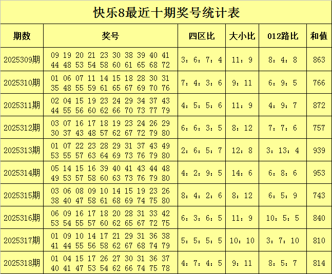 福彩快乐8第2025318期开奖回顾:01 04 15 17 26 27 30 31 36 37 40 41 47 53 54 62 66 74 75 78,其中奖号四区比为4:7:4:5。