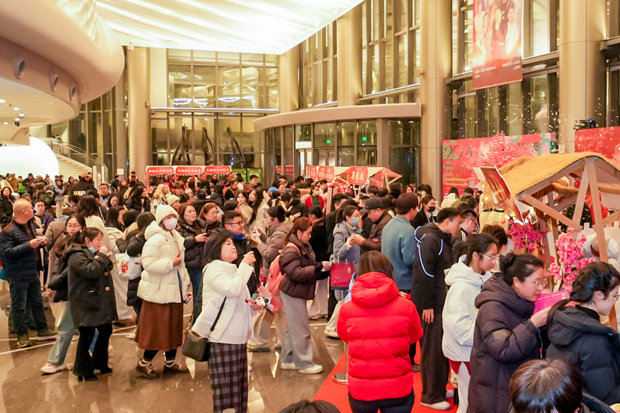 剧场大厅,一场“桃花流水宴”让人感受到一元复始,万象更新的氛围。非遗摊位前人声鼎沸,观众可以近距离了解奉贤的土布染织技艺与琉璃烧制技艺。现场还邀请了奉贤非遗“李记羊肉”赠汤,浓浓的暖香与苏州吴江带来的茶点甜香交织在一起,为冬日增添了几丝暖意。最热闹的当数互动区,有人浅酌一口特调的桃花酿,有人在投壶的游戏中赢得文创礼品,更有身着古装的“红娘”穿梭人群,以桃花为引邀请观众抽取缘分签,沉浸式游园让现场观众乐不思蜀。