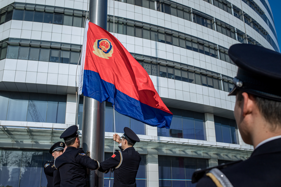 警歌嘹亮,旗帜高扬。1月10日,在第六个中国人民警察节到来之际,上海市公安局闵行分局举行升警旗仪式,民警代表列队向警旗敬礼。