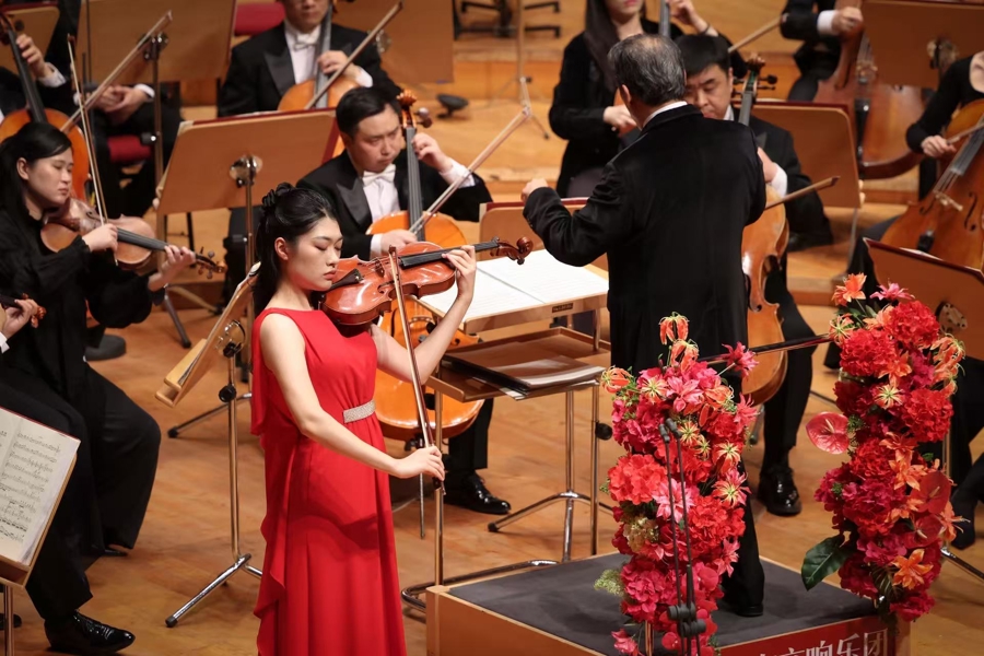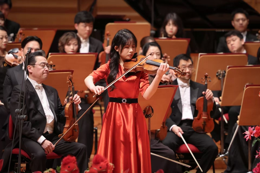 四位“00后”独奏家的表现更是惊艳全场。2007年出生的蔡珂宜,曾在10岁、11岁接连斩获国际小提琴赛事冠军,今年7月发行的莫扎特协奏曲专辑登顶苹果古典音乐全球榜单,被乐迷亲切称为“蔡教授”。这是她首次与上交合作,带来的《卡门幻想曲》,是韦克斯曼应海菲茨请求,为电影《狂想曲》音乐扩展而成的经典之作。